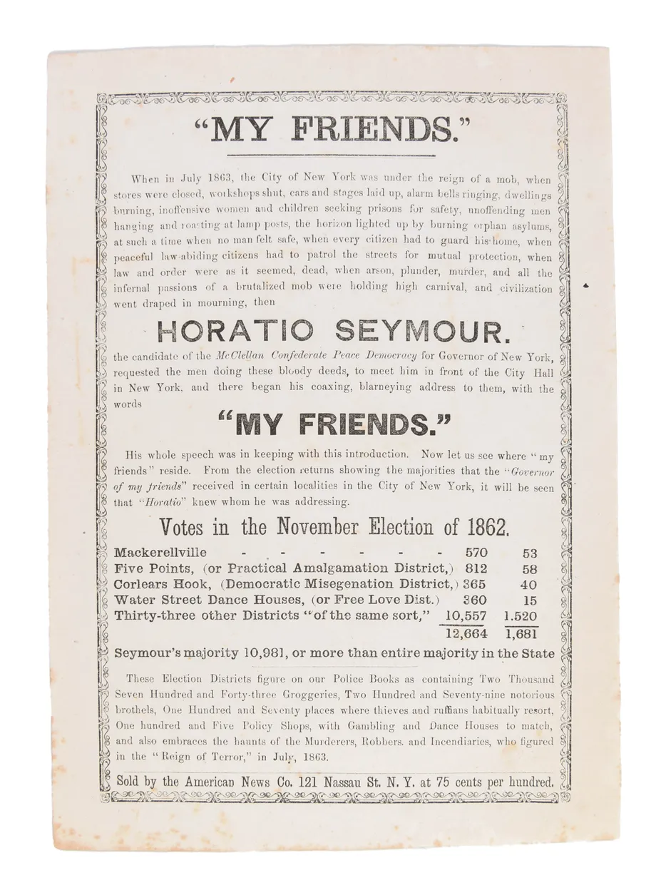 Governor Seymour was on holiday in New Jersey at the time and returned to held re-establish order in the city. The broadside reads: "When arson, plunder, murder, and all the infernal passions of a brutalized mob were holding high carnival, and civilization went draped in mourning" Seymour "requested the men doing these bloody deeds, to meet him in from of the City Hall in New York, and there began his coaxing, blarneying address to them, with the words 'MY FRIENDS.' His whole speech was in keeping with this introduction."